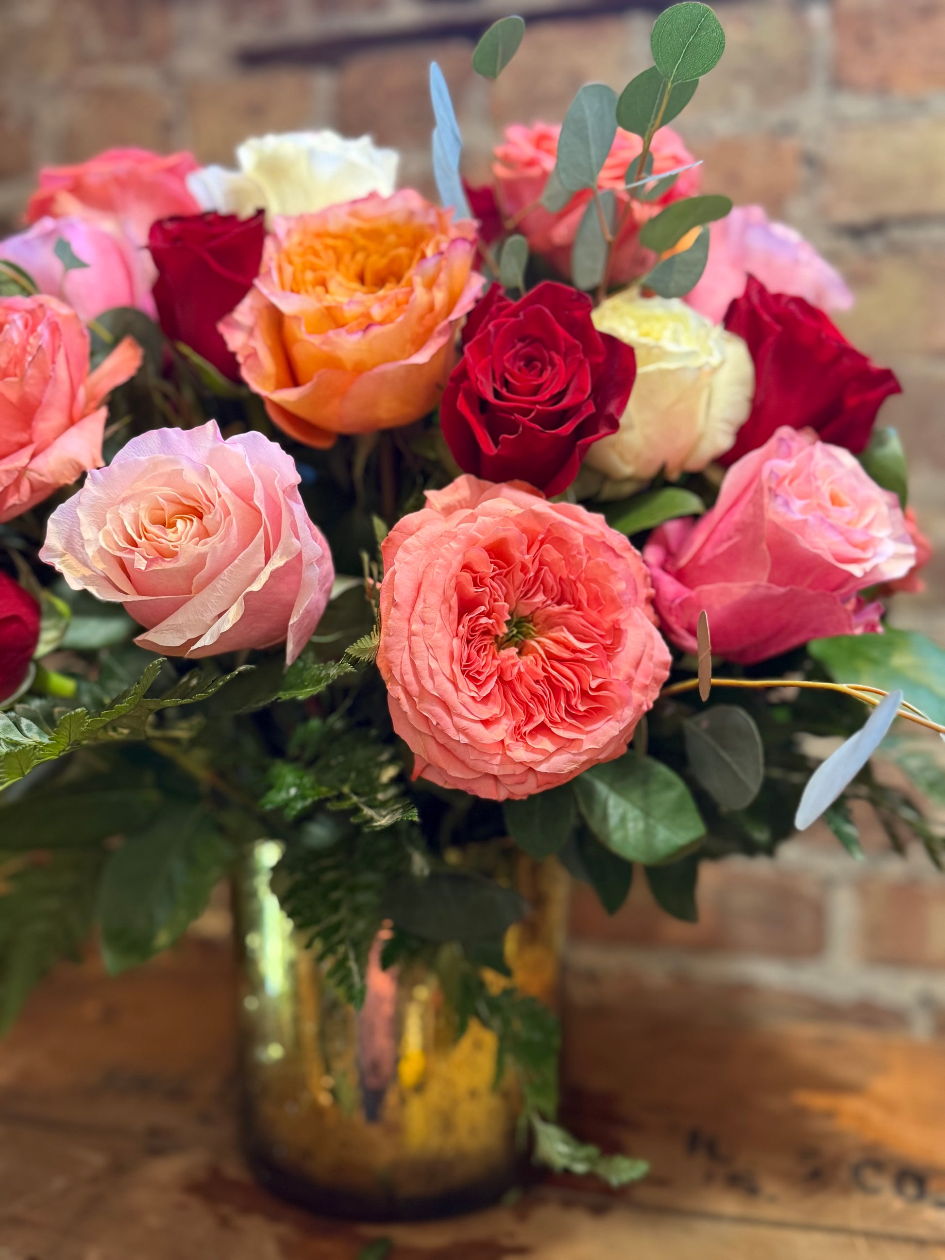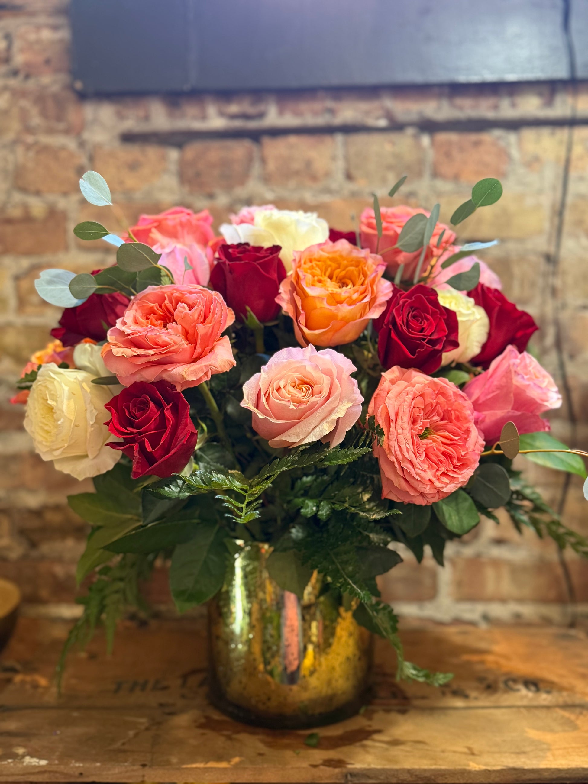 Here is an elegant blend of three dozen roses arranged in a golden glass cylinder vase. Compact yet lush, this arrangement is filled with classic roses blended with fragrant garden roses for a rich, timeless feel.