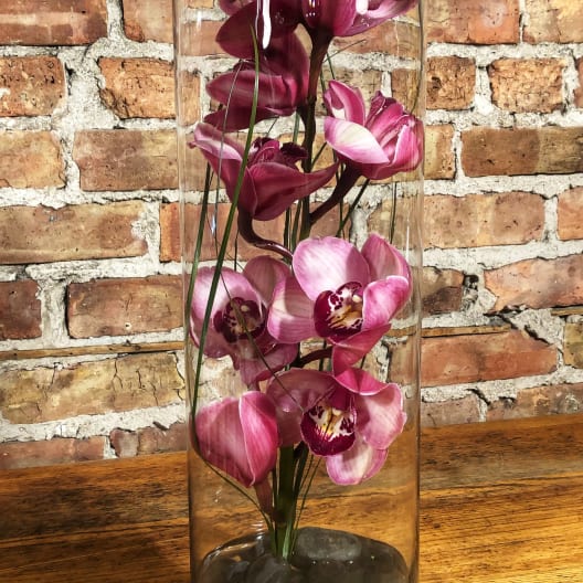 A single cymbidium orchid nestled inside of a clear 16” cylinder with bear grass and river rock.